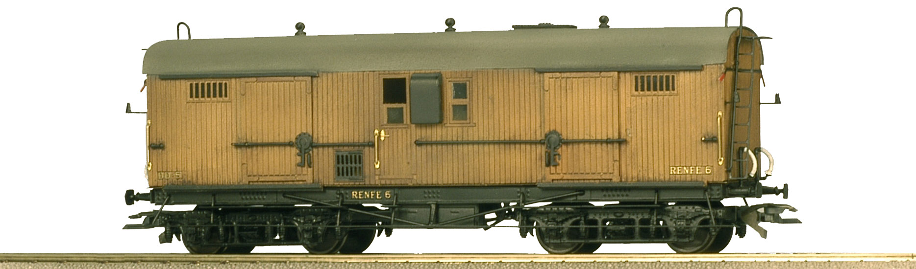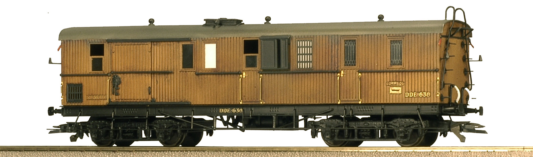 Furgón RENFE serie DDE-638 fabricado fielmente a la realidad integramente en latón, montado y pintado a mano uno a uno.